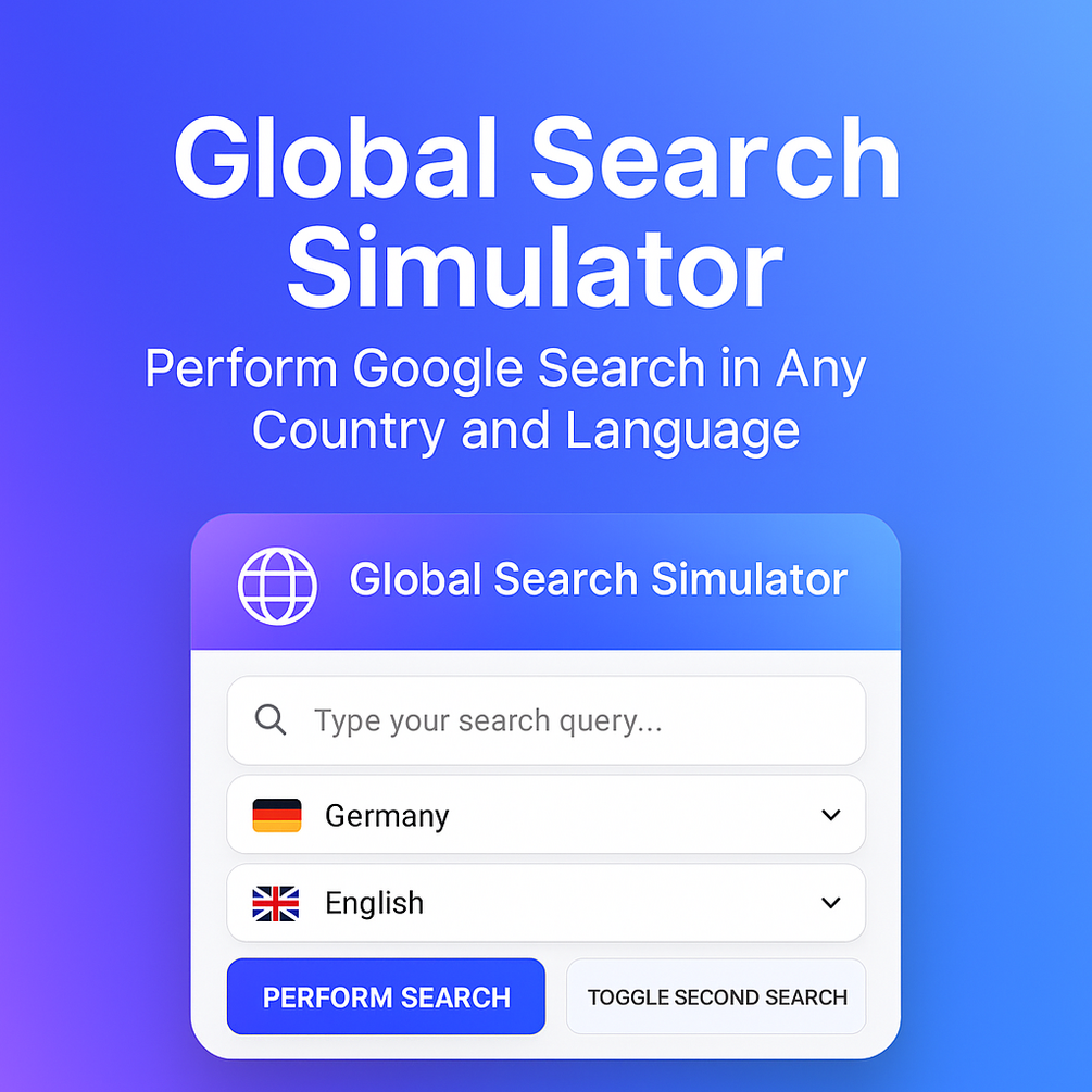 π‘ What Youβll Get with Global Search Simulator β Accurate Google SERP Previews See how your keywords rank in any country and language β instantly. β Global SEO Testing in Seconds Run geo-targeted Google searches without needing VPNs or proxies. β Easy Keyword Localization Test how your content performs in Germany, UK, Brazil, and more. β Language-Based SERP Analysis Understand how search results differ for multilingual audiences. β One-Click Search Toggle Quickly compare two variations of a search β perfect for A/B testing. β Modern, User-Friendly UI Clean, responsive design built for productivity and speed. β Cross-Browser Visibility Testing (Coming Soon) Analyze how your site appears on Bing, Yahoo, and others too. β No Tracking, 100% Privacy No accounts, no ads, no data collection β everything stays on your browser.